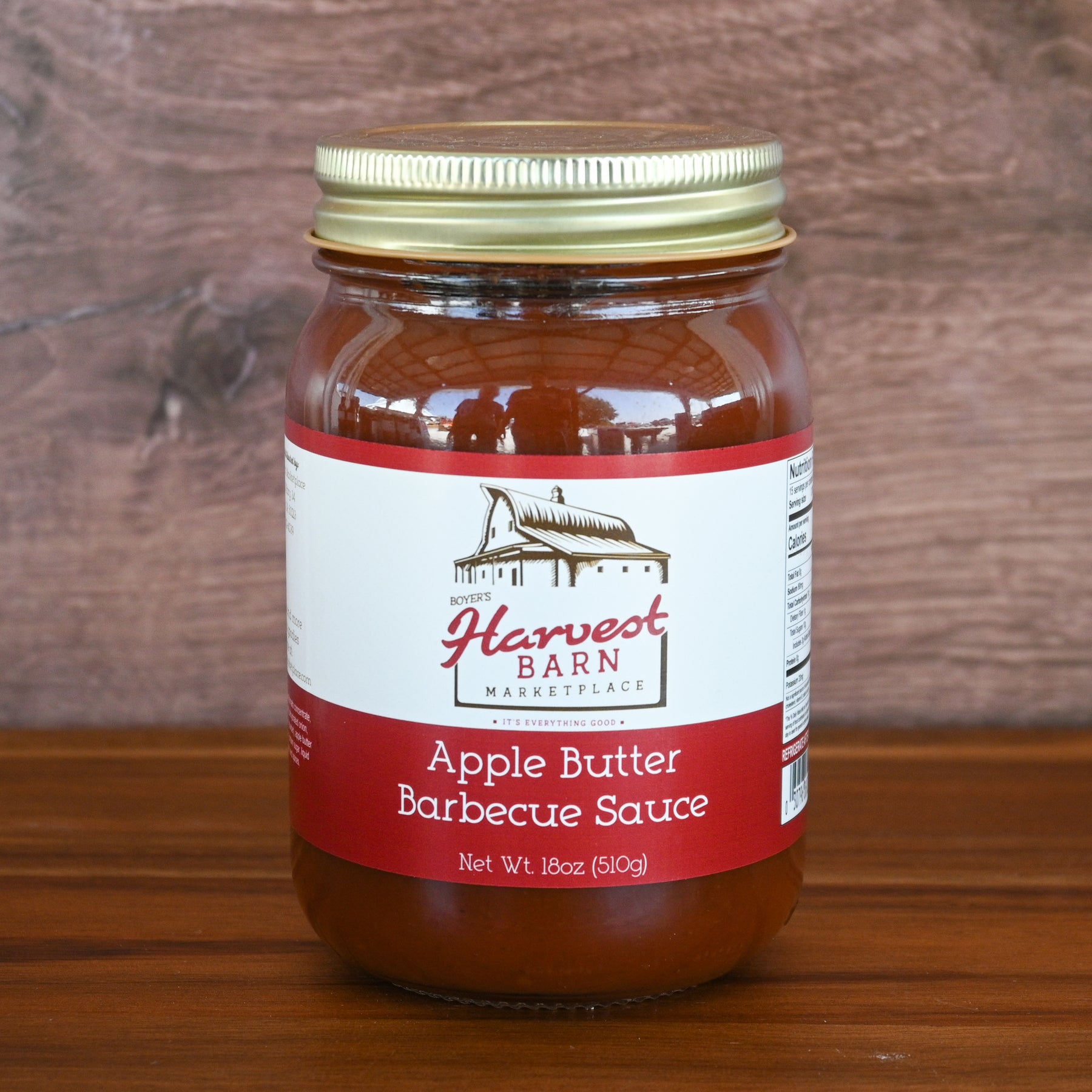 Jar of Apple Butter Barbecue Sauce from Harvest Barn Marketplace on a wooden surface with a wooden background.