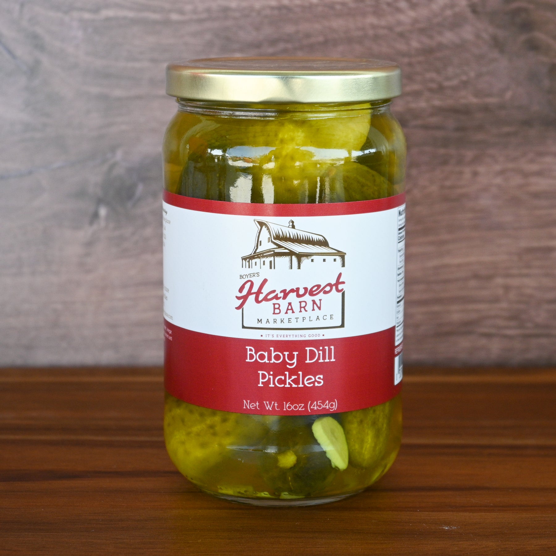 Jar of baby dill pickles with a Harvest Barn label on a wooden surface.